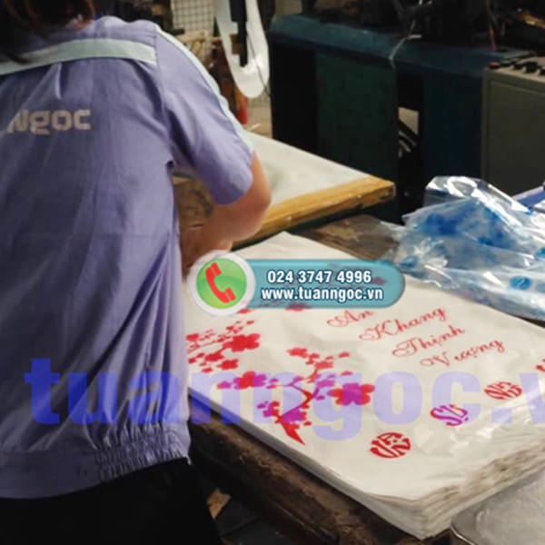 - Chi tiết in : cành đào, chữ đỏ – the0 yêu cầu