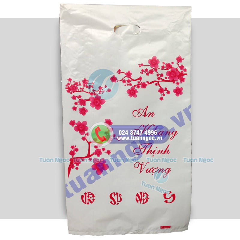 Túi nilon đựng lịch có in cành đào màu đỏ đẹp mắt và dòng chữ An Khang Thịnh Vượng – Vạn Sự như ý thích hợp với bộ lịch gồm 1 – 8 tờ. Hàng có sẵn số lượng lớn làm quà tặng , liên hệ để được báo giá tốt nhất ngày hôm nay