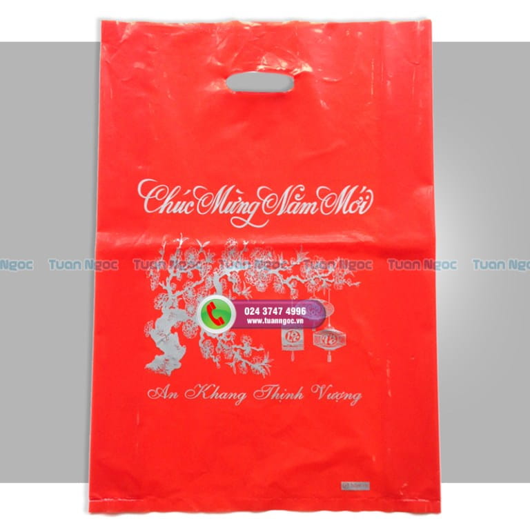 Chuyên sản xuất túi nilon màu đỏ bóng đẹp in chúc mừng năm mới , 2 loại in chữ màu vàng và trắng bạc. Kích thước lớn đựng vừa thùng bia, giỏ qua hay lịch Tết :